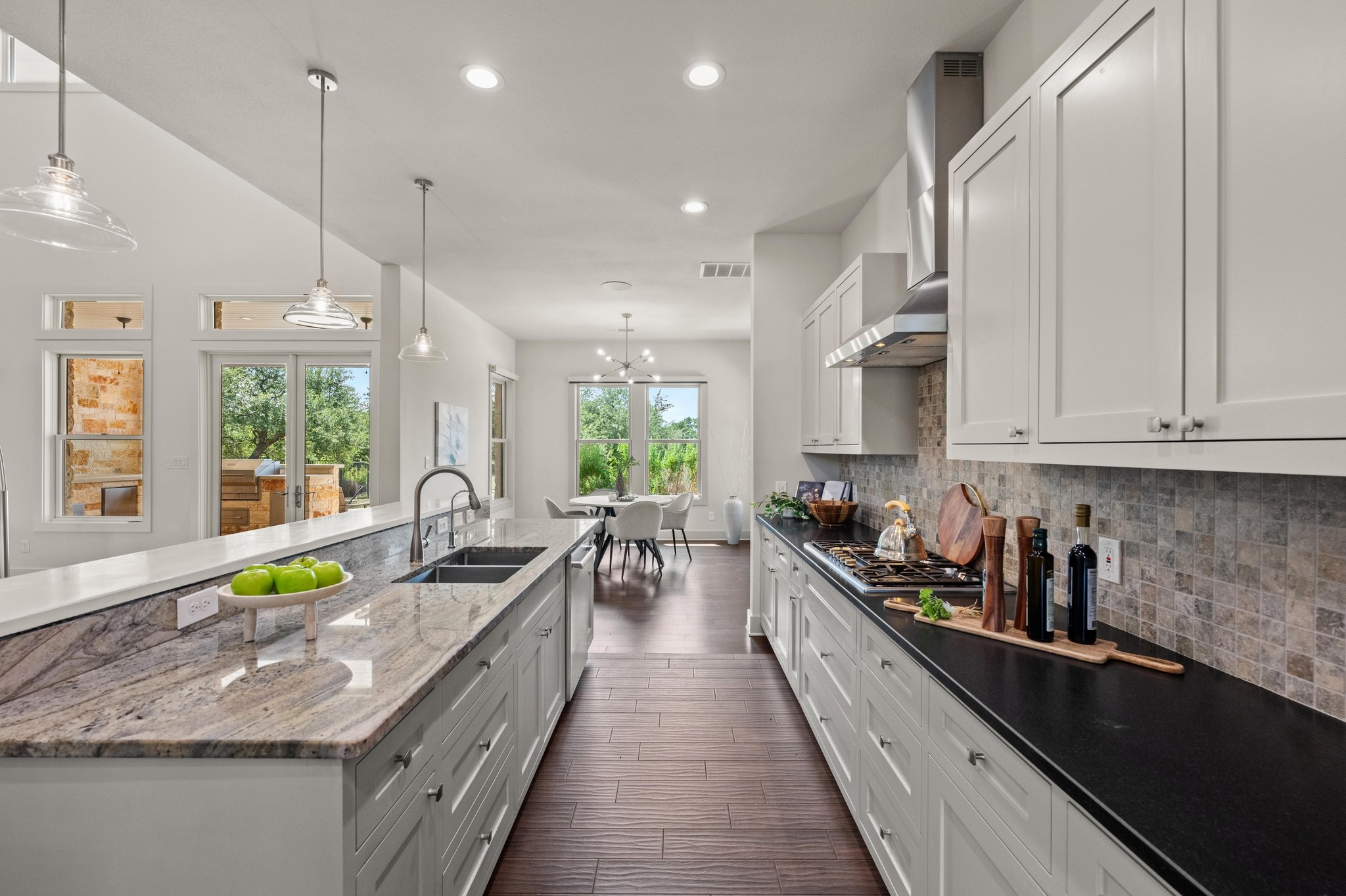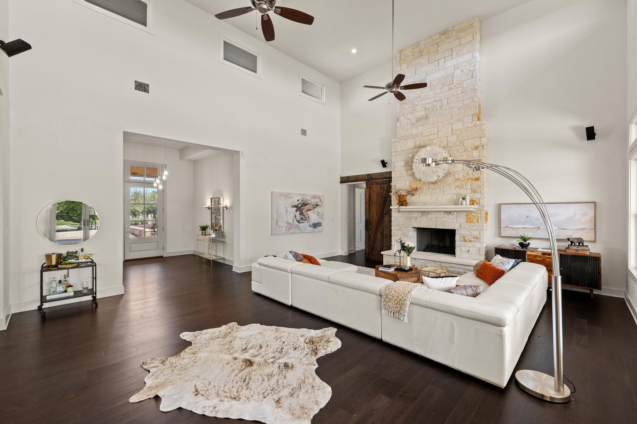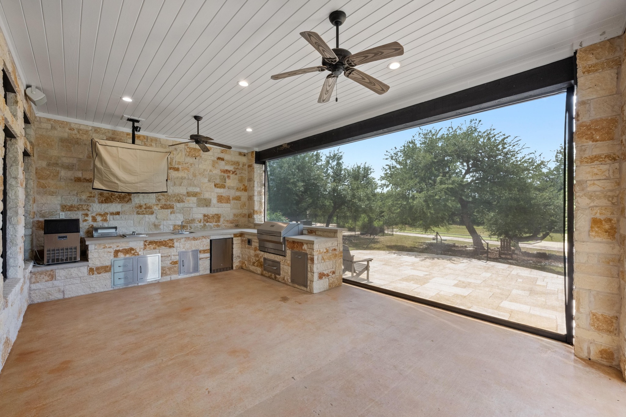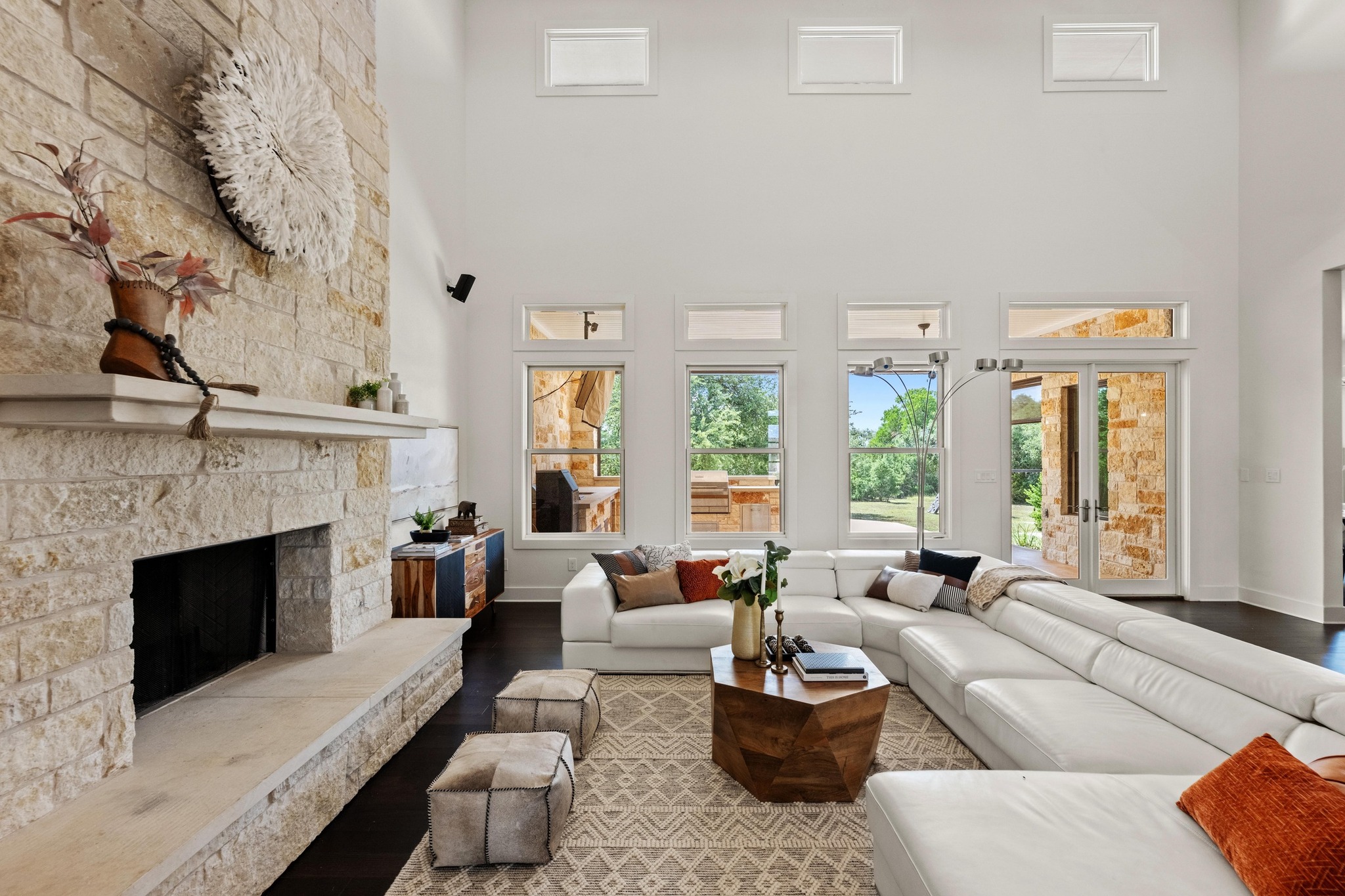 Step inside to discover a sprawling interior that blends elegance with comfort. A striking limestone fireplace serves as the heart of the open-concept living area, where vaulted ceilings and oversized windows bathe the space in natural light, showcasing the rolling Hill Country vistas. The private master suite is a sanctuary, leading to a spa-inspired bathroom with a deep soaking tub, a sparkling walk-in shower, and sophisticated backlit mirrors. Each additional bedroom offers its own en-suite bathroom and generous walk-in closet, ensuring privacy and convenience for all. The gourmet kitchen is a chef’s dream, featuring a dedicated coffee bar area and an oversized pantry for ample storage. Throughout the home, automated lighting systems—both interior and exterior—offer effortless control, whether you’re at home or away, adding a layer of modern sophistication.