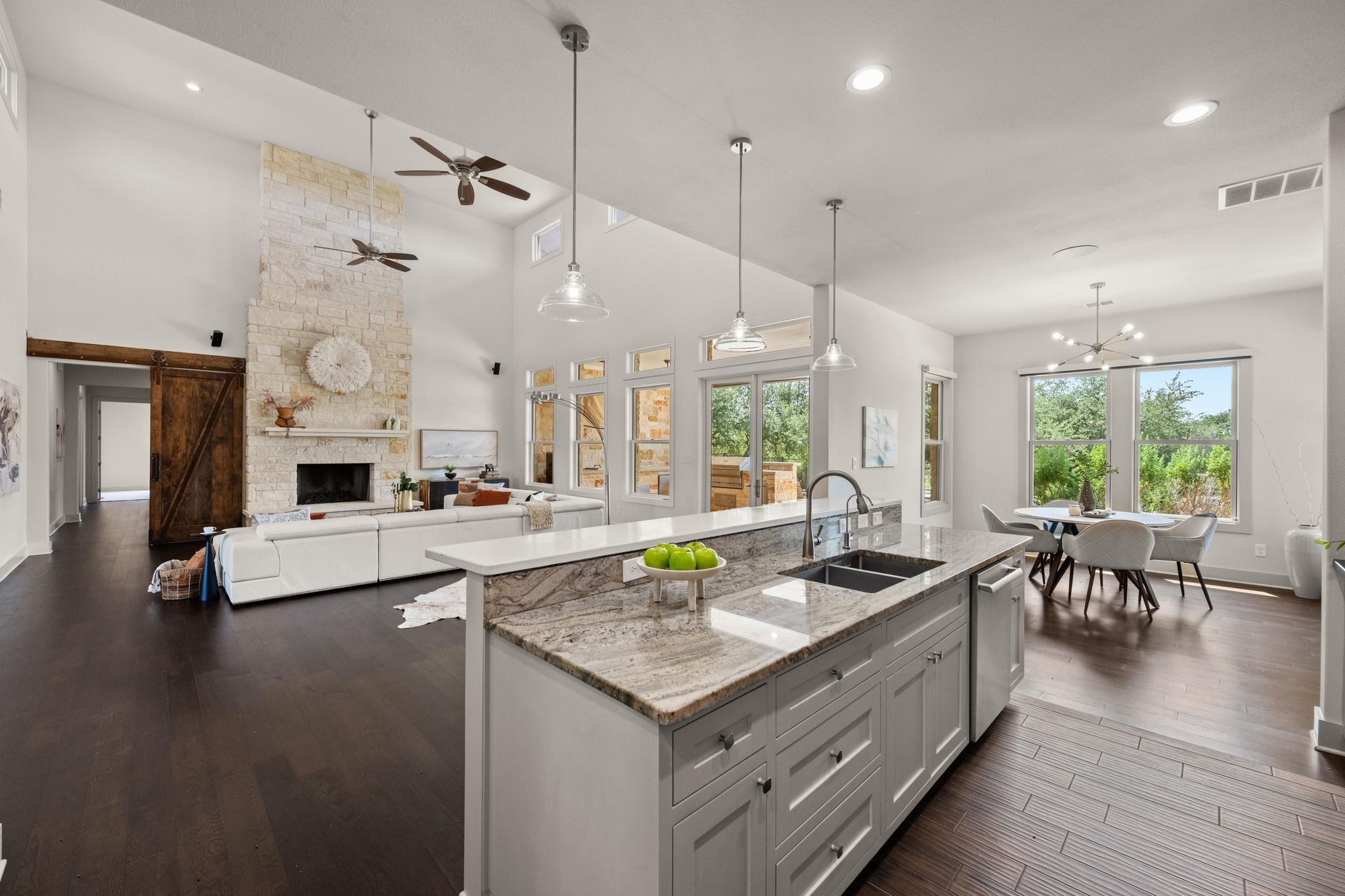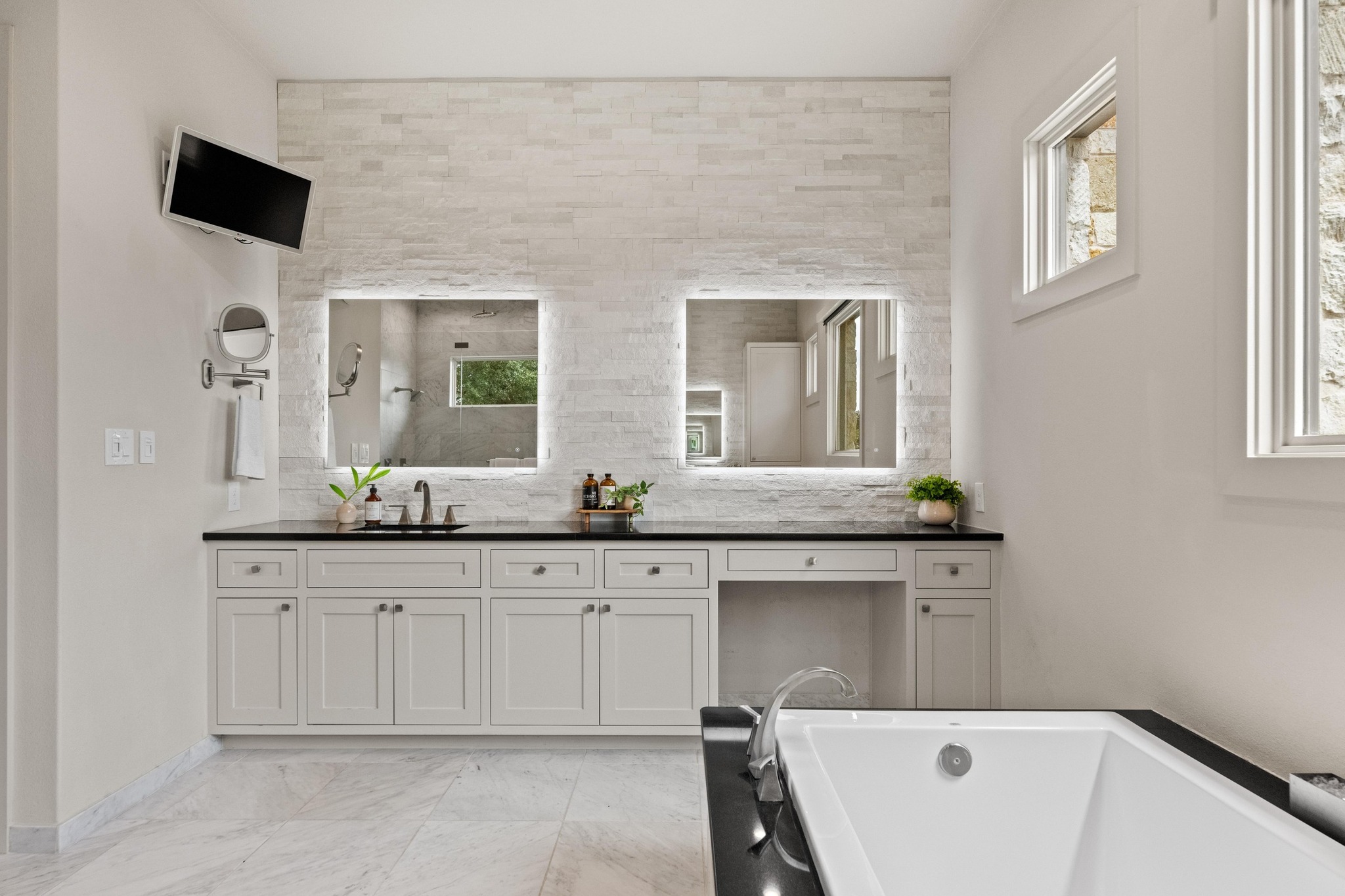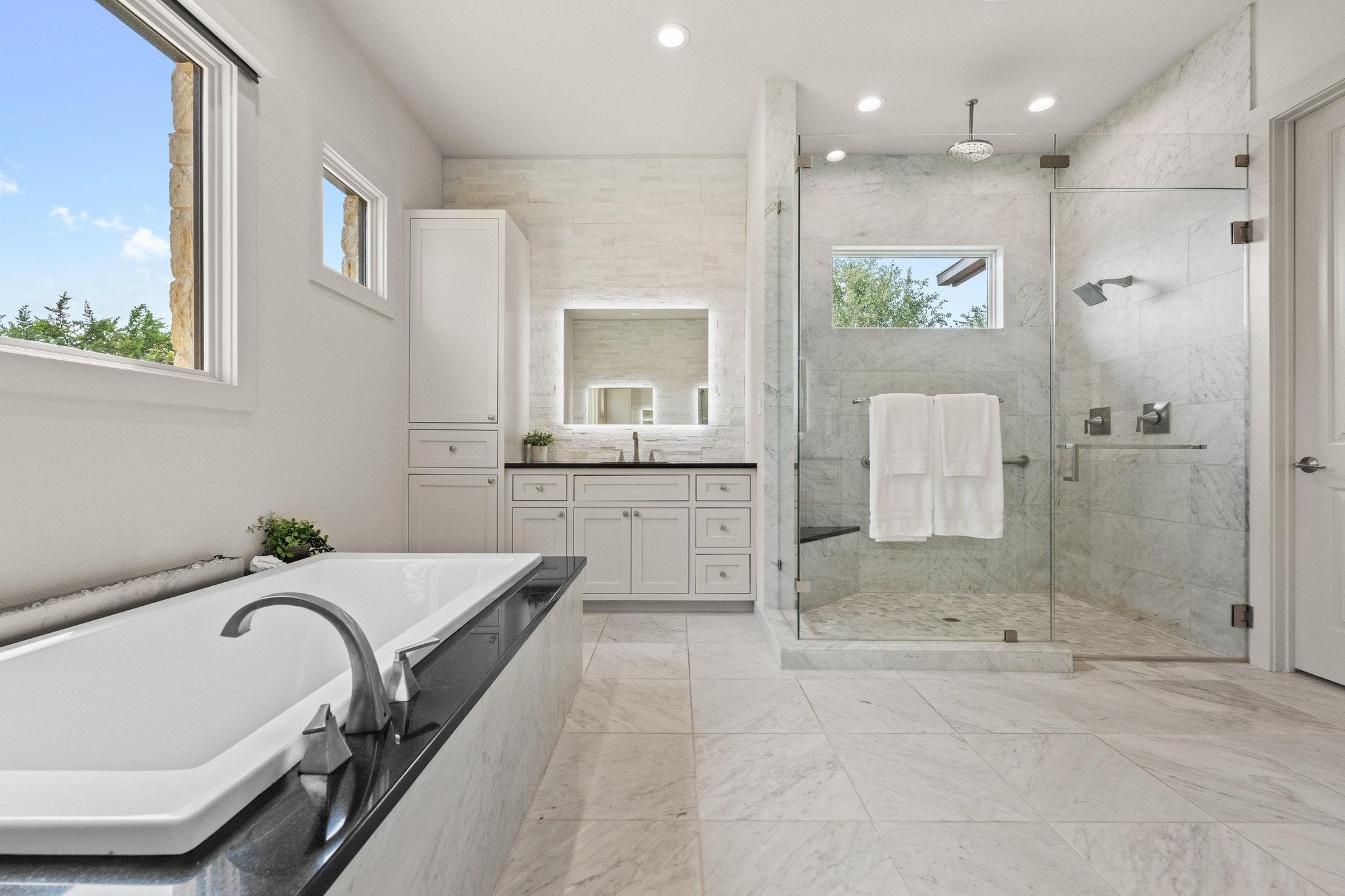 Step inside to discover a sprawling interior that blends elegance with comfort. A striking limestone fireplace serves as the heart of the open-concept living area, where vaulted ceilings and oversized windows bathe the space in natural light, showcasing the rolling Hill Country vistas. The private master suite is a sanctuary, leading to a spa-inspired bathroom with a deep soaking tub, a sparkling walk-in shower, and sophisticated backlit mirrors. Each additional bedroom offers its own en-suite bathroom and generous walk-in closet, ensuring privacy and convenience for all. The gourmet kitchen is a chef’s dream, featuring a dedicated coffee bar area and an oversized pantry for ample storage. Throughout the home, automated lighting systems—both interior and exterior—offer effortless control, whether you’re at home or away, adding a layer of modern sophistication.