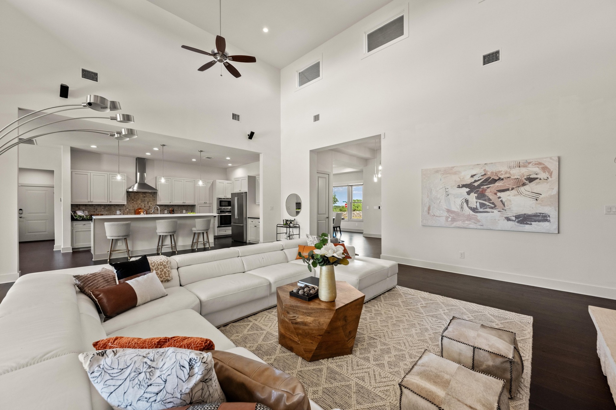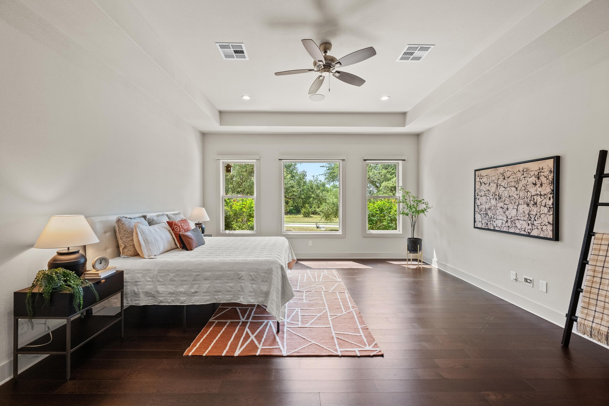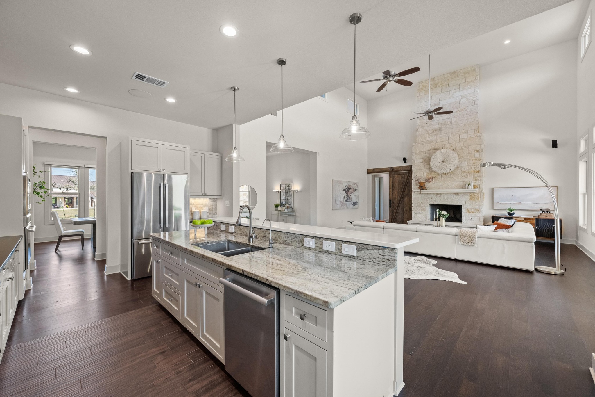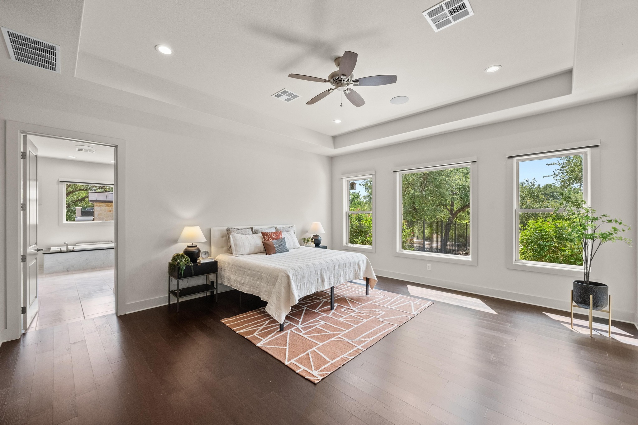 Step inside to discover a sprawling interior that blends elegance with comfort. A striking limestone fireplace serves as the heart of the open-concept living area, where vaulted ceilings and oversized windows bathe the space in natural light, showcasing the rolling Hill Country vistas. The private master suite is a sanctuary, leading to a spa-inspired bathroom with a deep soaking tub, a sparkling walk-in shower, and sophisticated backlit mirrors. Each additional bedroom offers its own en-suite bathroom and generous walk-in closet, ensuring privacy and convenience for all. The gourmet kitchen is a chef’s dream, featuring a dedicated coffee bar area and an oversized pantry for ample storage. Throughout the home, automated lighting systems—both interior and exterior—offer effortless control, whether you’re at home or away, adding a layer of modern sophistication.